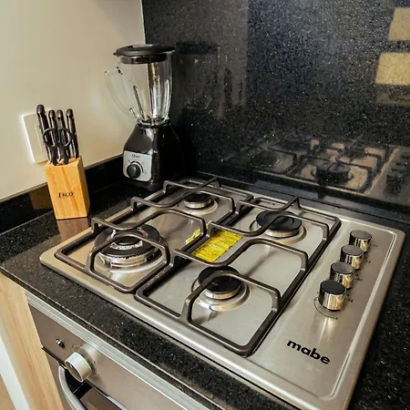 台所では自分で食事を作ることができます。 Alojamiento A/C, Gym, Cafeteria | Auditorio Telmexアパートかなり近くほどのところにOmni de Mexico Guadalajara-Mercado del Marバス停があります。